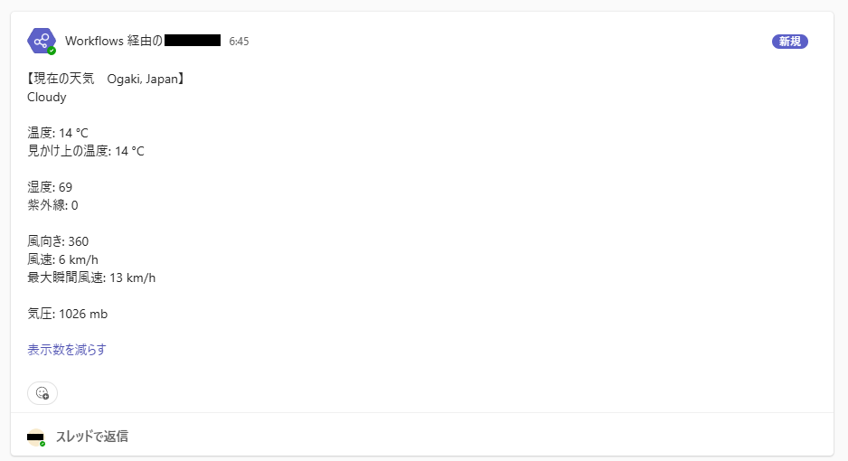 下図は、実際に取得した天気情報をTeamsに投稿したものです。